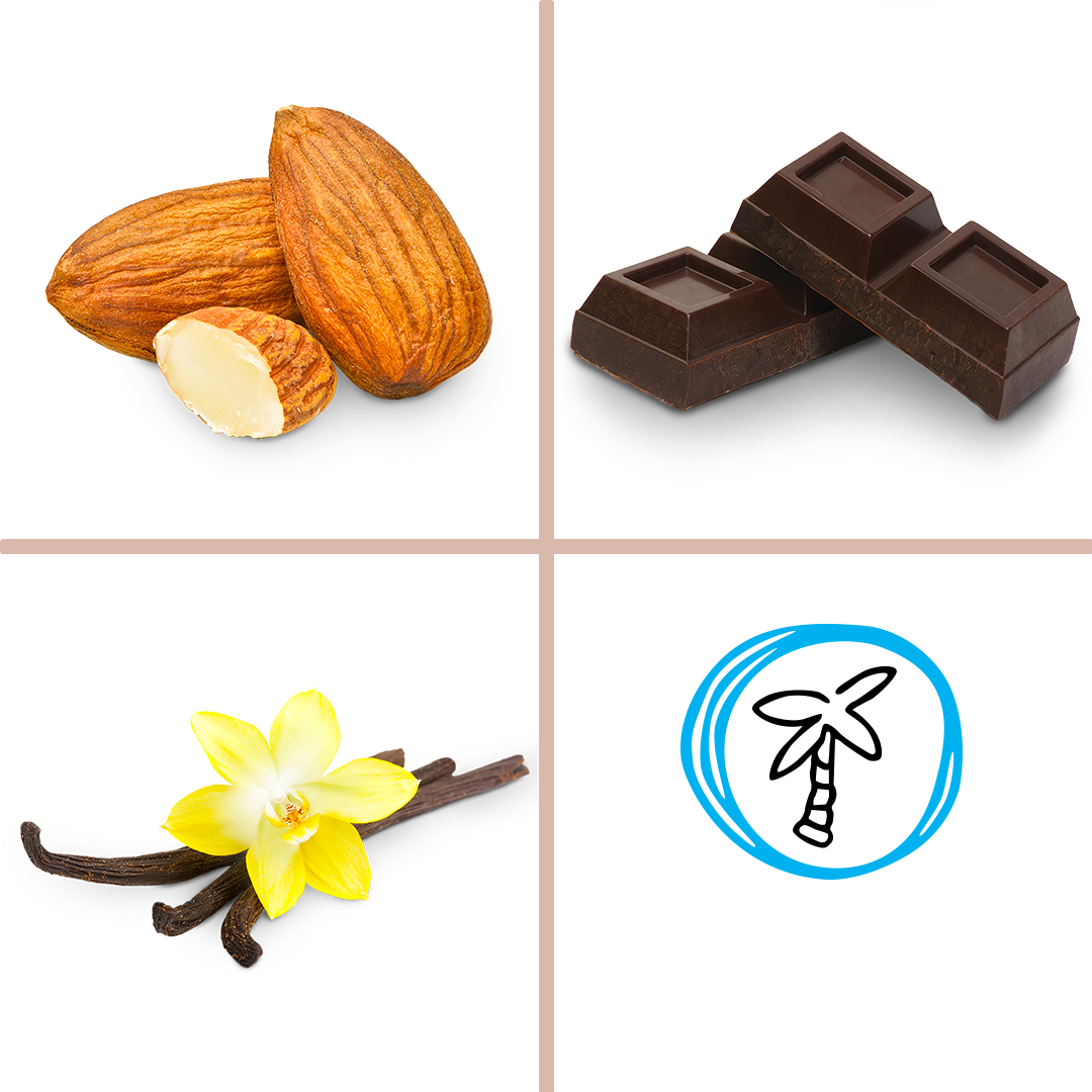 68% mandle natural pražené, 10% čokoláda sedmdesátiprocentní/sedemdesiatpercentní (kakaová hmota, cukr/cukor, kakaové máslo/maslo, sójový lecitin/lecitín, vanilka bourbon Madagaskar), 10% kokosový cukr/cukor, 10% kokosový olej, 2% perníkové koření