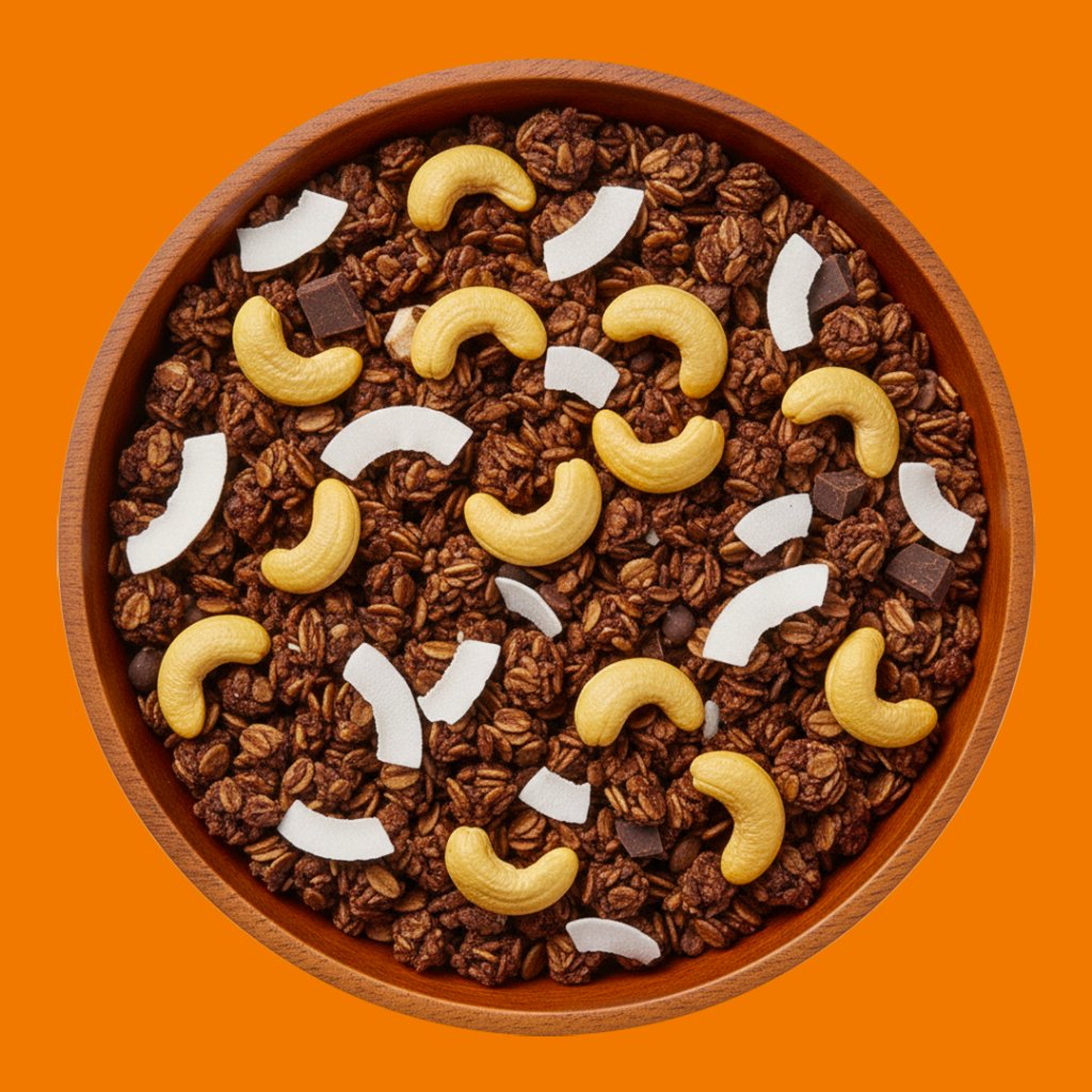 Zapečená směs bezlepkových ovesných vloček, vybraných ořechů a poctivé čokolády. Kombinace jemné sladkosti rýžového sirupu, kešu, kokosových chipsů a kvalitního kakaa vytváří plnou, lehce intenzivní chuť, která potěší každého milovníka čokolády.