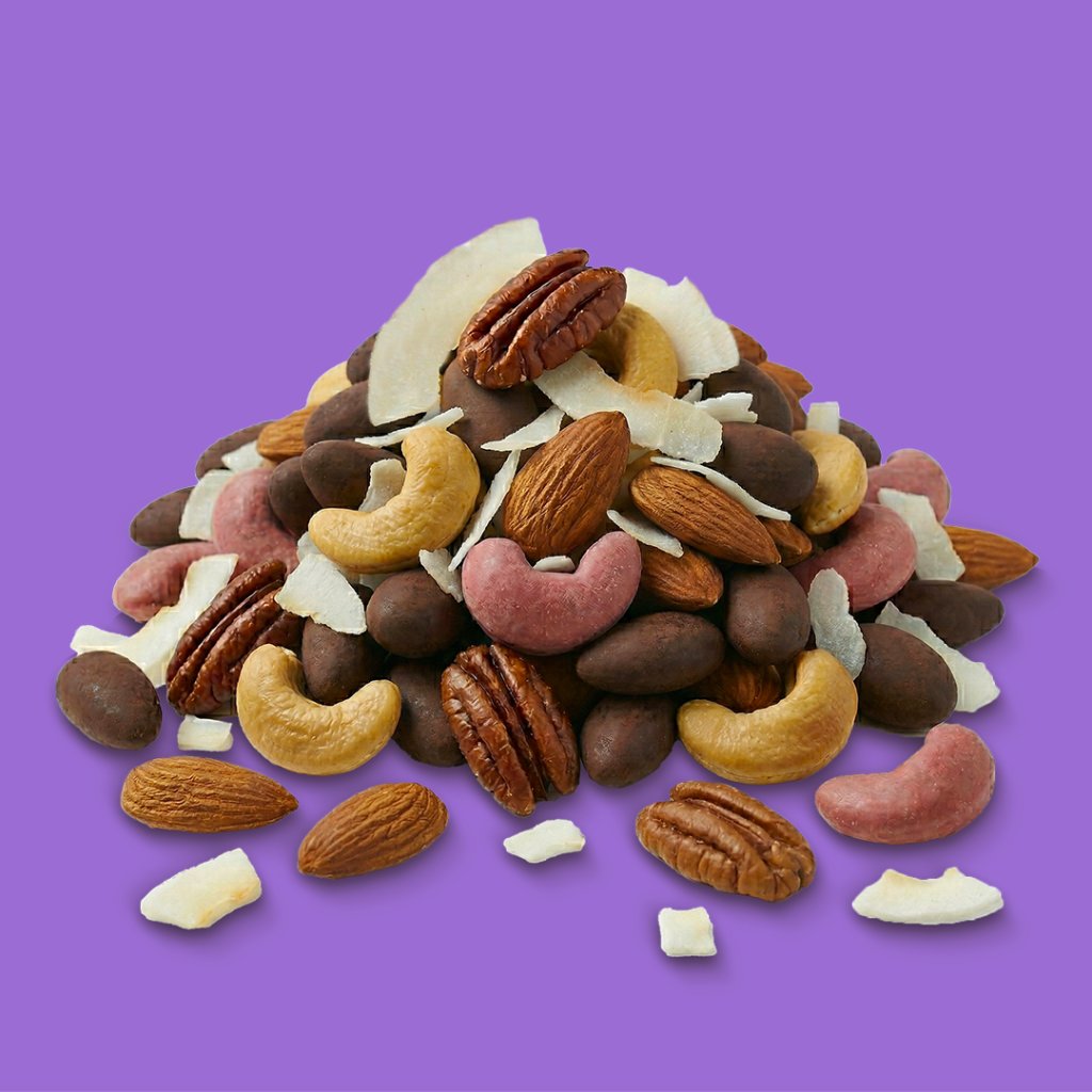 53% směs naturálních ořechů (kešu, mandle , pekan, kokos chips ), 26% směs ořechů v koření (kešu paprika (97,4% kešu pražené, 1,8% sůl, 0,8% práškové aroma Red pepper, Arabská guma), mandle uzené (98,2 % mandle pražené, 1,4 % sůl, 0,4 % aroma kouřové), mandle paprika (97,4% mandle pražené, 1,8% sůl, 0,8% práškové aroma Red pepper, Arabská guma), 21% směs ořechů v čokoládě (kokos chips slaný karamel (kokosové plátky pražené 71,4%, třtinový cukr, mořská sůl 0,6%), mix pražených ořechů (kešu ořechy, mandle loupané, pekanové ořechy), 21,7% ruby čokoláda (cukr, kakaové máslo, sušené odtučněné mléko, plnotučné sušené mléko, kakaová hmota, emulgátor: sójový lecithin, regulátor kyselosti: kyselina citrónová, přírodní vanilkové aroma), 21,7% karamelová čokoláda (kakaové máslo, cukr, sušené plnotučné mléko, mléčný cukr, syrovátkový prášek (mléko), sušené odtučněné mléko, karamelizovaný cukr 2%, emulgátor: sójový lecithin, přírodní vanilkové aroma, 21,7% mléčná čokoláda (cukr, kakaové máslo, plnotučné sušené mléko, kakaové boby, emulgátor: řepkový lecithin, bourbon vanilka.