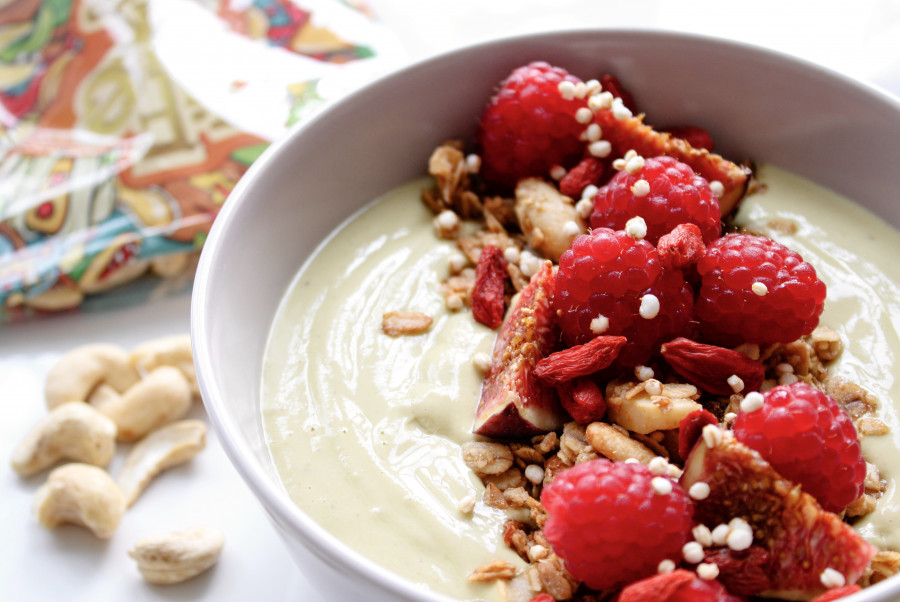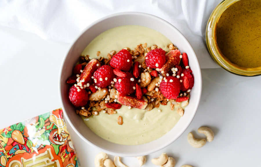 Kešu ořechy si namočíme přes noc. ⏰ Další den všechny ingredience (včetně kešu) vložíme do mixéru a mixujeme, dokud nevznikne hladký krém. Poté krém nalijeme do misky. 🥣 Přidáme oblíbenou granolu, ovoce a podle chuti goji či jiné semínka. 🍓